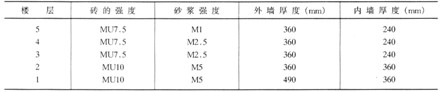 在設計中,滿足《規程》是基本的要求,但僅從《規程》出發進行加固設計存在以下問題:無法體現局部墻體加固后抗震的情況;計算結果粗糙;需采用手算進行統計及計算。因此,在設計方案在設計方案滿《規程》要求的同時,采用“剛度折算模型方法”,應用“PMCAD——磚混結構抗震驗算”軟件對加固方案進行輔助分析。該方法主要是將混凝土夾板墻按剛度比(彈性模量比)折算為磚墻,同時調整磚砌體設計密度,以保證恒荷載設計值與實際情況相符。在本工程中,各層磚及砂漿的強度不同(表2),因此各層磚墻的折算剛度不同,層1~5混凝土與砌體剛度比分別為:11.8,11.8,15.6,18.1,23.4計算中層1、2及層3、4、5分別采用剛度比10(<11.8)及15(<15.6)進行分析,即將混凝土夾板墻模擬為厚度增大10、15倍速的磚墻。為保持墻體荷載與實際情況基本相符,算得當混凝土與磚墻剛度比采用10時,磚墻密度取11kN/m3;剛度比采用15時,磚墻蜜度取9kN/m3。